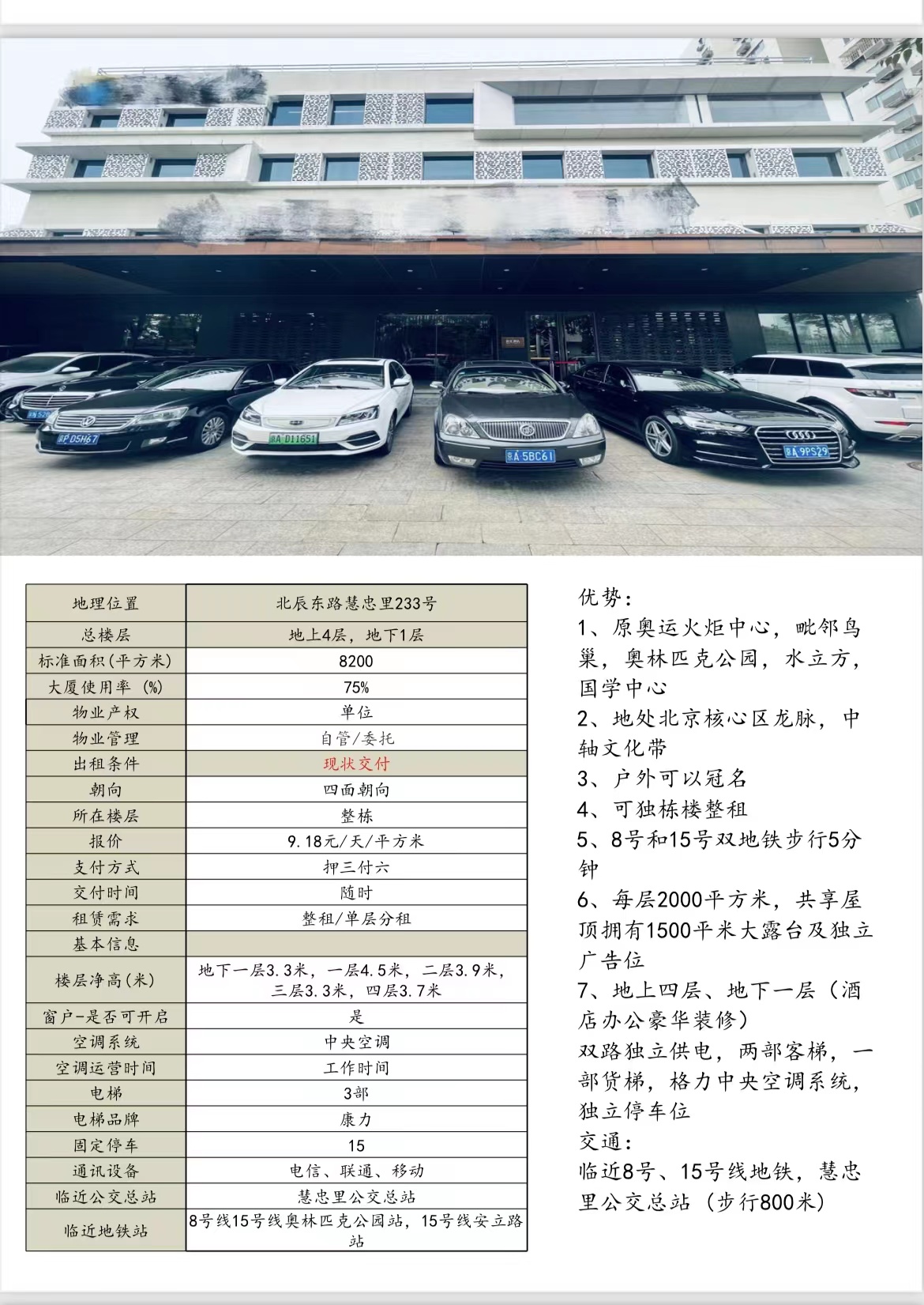 北京北辰東路鳥巢寫字樓一亞奧獨棟,該項目位于北四環(huán)至北五環(huán)之間,屬于鳥巢核心的亞奧商圈,獨棟寫字樓,獨立的院子,停車方便,戶型方正,遺留裝修,獨棟寫字樓出租,獨棟物業(yè)出租,獨棟辦公室出租,商圈成熟,配套齊全,交通便利,非常適合做企業(yè)獨棟總部辦公大樓!