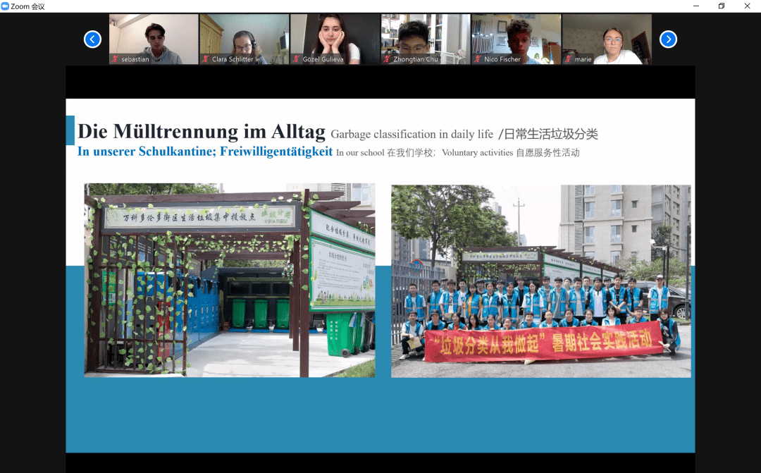 在雙方在線互動(dòng)研討的環(huán)節(jié)中,青島九中紀(jì)皓然、張秀文、崔家豪三位同學(xué)以環(huán)境保護(hù)和可持續(xù)發(fā)展為主題,結(jié)合精心制作的PPT,用德語為大家?guī)砹司实恼故?。德方Nico Fischer同學(xué)和Lenap同學(xué)也以德國垃圾回收為主題進(jìn)行介紹。通過介紹,大家對(duì)彼此的綠色理念、環(huán)保措施、垃圾分類以及回收體系有了比較深入的了解,也找到了很多值得學(xué)習(xí)和借鑒之處。
