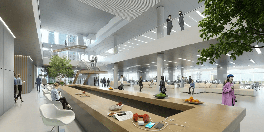 空中大堂高效連接高低兩區(qū),也為辦公人員提供了方便可達、視野開闊的休憩場所。
