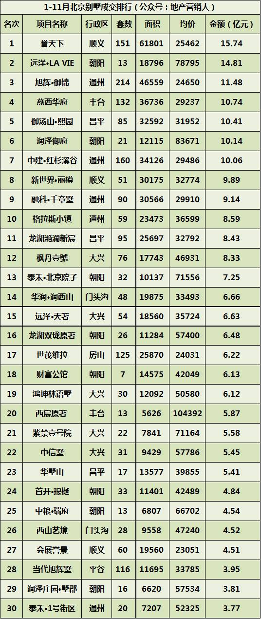 別墅市場新增供應(yīng)4675套,同比上漲15%;成交3020套,同比上漲87%;成交面積95.12萬㎡,同比上漲81%;成交均價34268元/㎡,同比下降1%;成交金額325.96億元,同比上漲80%;目前存量9450套;成交排行前30項目如下: