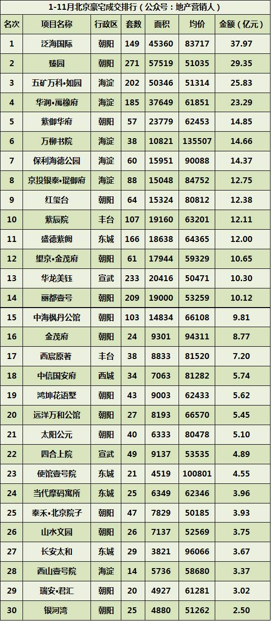 單價在50000元/㎡以上豪宅市場成交2479套,同比上漲118%;成交面積46.66萬㎡,同比上漲108%;成交均價69655元/㎡,同比上漲6%;成交金額325.02億元,同比上漲121%;成交排行前30項目如下: