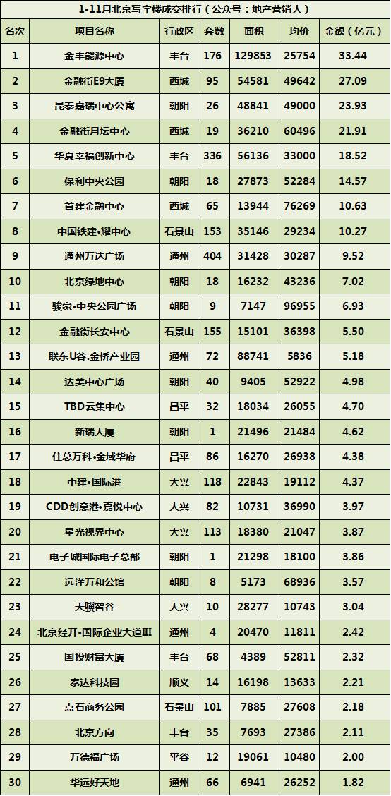 寫字樓市場新增供應(yīng)7368套,同比上漲75%;成交3264套,同比下降13%;成交面積100.87萬㎡,同比下降16%;成交均價28409元/㎡,同比上漲58%;成交金額286.56億元,同比上漲33%;目前存量16239套;成交排行前30項目如下: