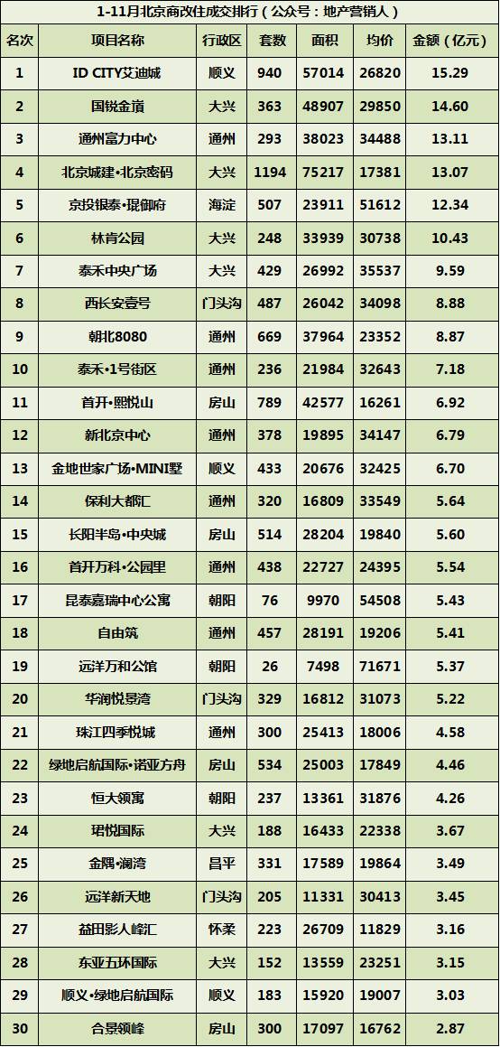 自住型商品房市場新增供應(yīng)22161套,同比上漲27%;成交23333套,同比上漲91%;成交面積206.72萬㎡,同比上漲93%;成交均價18504元/㎡,同比上漲4%;成交金額382.5億元,同比上漲100%;目前存量4101套;成交排行前30項目如下: