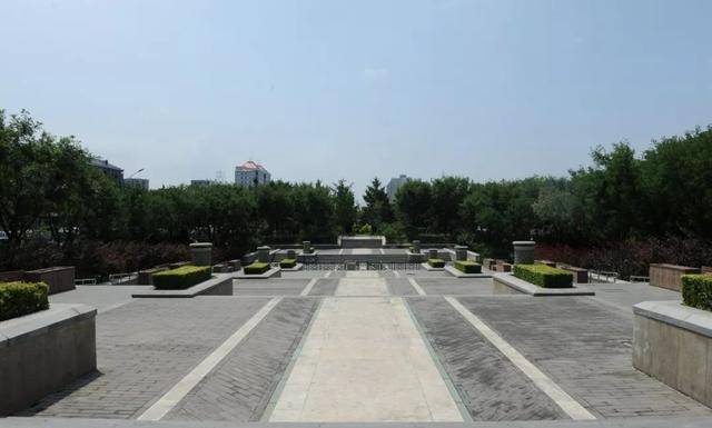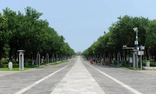 永定門公園內(nèi),順著中軸線,是一條筆直的甬道,中間是大石鋪就