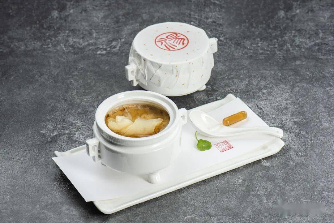 佐以紹興酒的「鱘龍魚(yú)筋荸薺湯」由兩種肉一氣呵成打成肉茸,再用荸薺來(lái)增加湯的口感和甘甜,蒸 4 小時(shí)后加入原味的鱘魚(yú)筋吸收肉湯精華,醇厚而不膩,加入的韶關(guān)酒讓濃郁的湯變得更加美味。