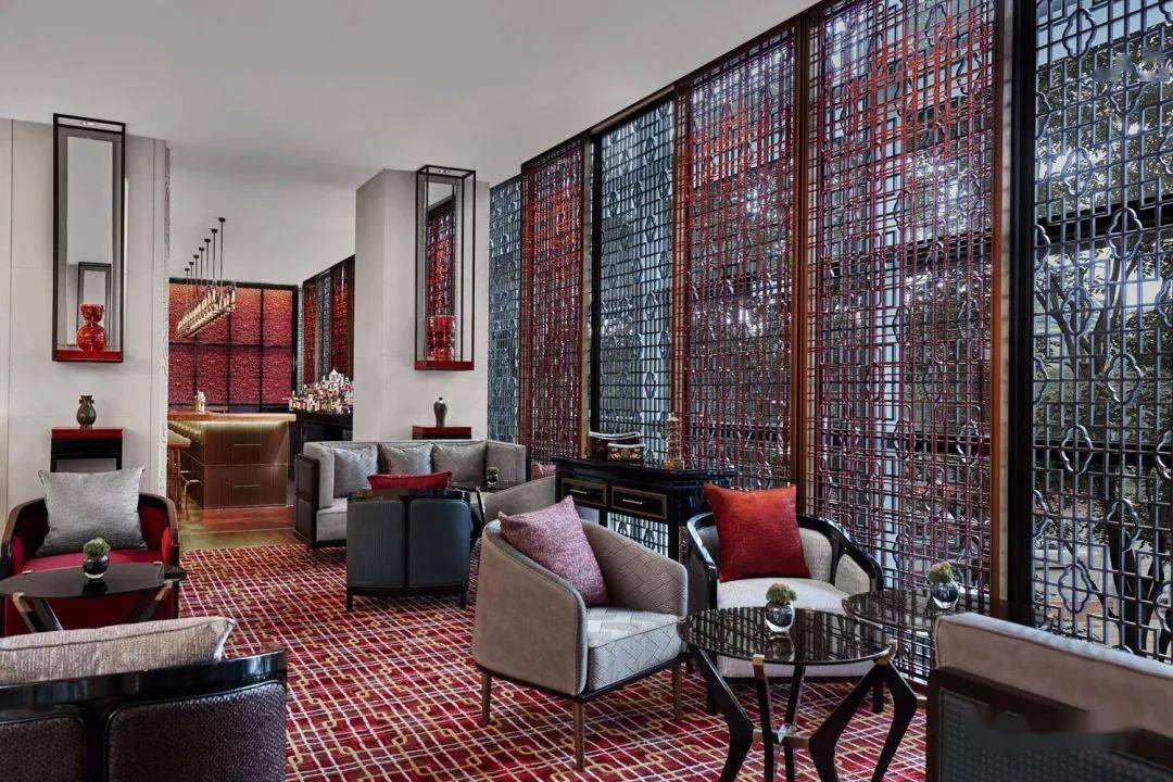 軒廊酒吧位于酒店二層長(zhǎng)廊,一覽繁華的金融街,讓客人沉浸在放松的綠洲之中。該空間的格局繼承了酒店的新中式設(shè)計(jì)和風(fēng)水原則。以現(xiàn)代手法微妙詮釋了植根于此地的老北京記憶——傳統(tǒng)明清民居中的木雕、窗欞與燈籠等元素在此一一呈現(xiàn)。